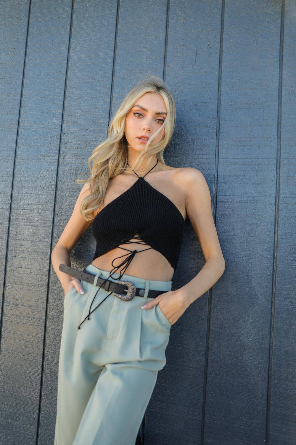 Lace-Up Halter Knit Bralette